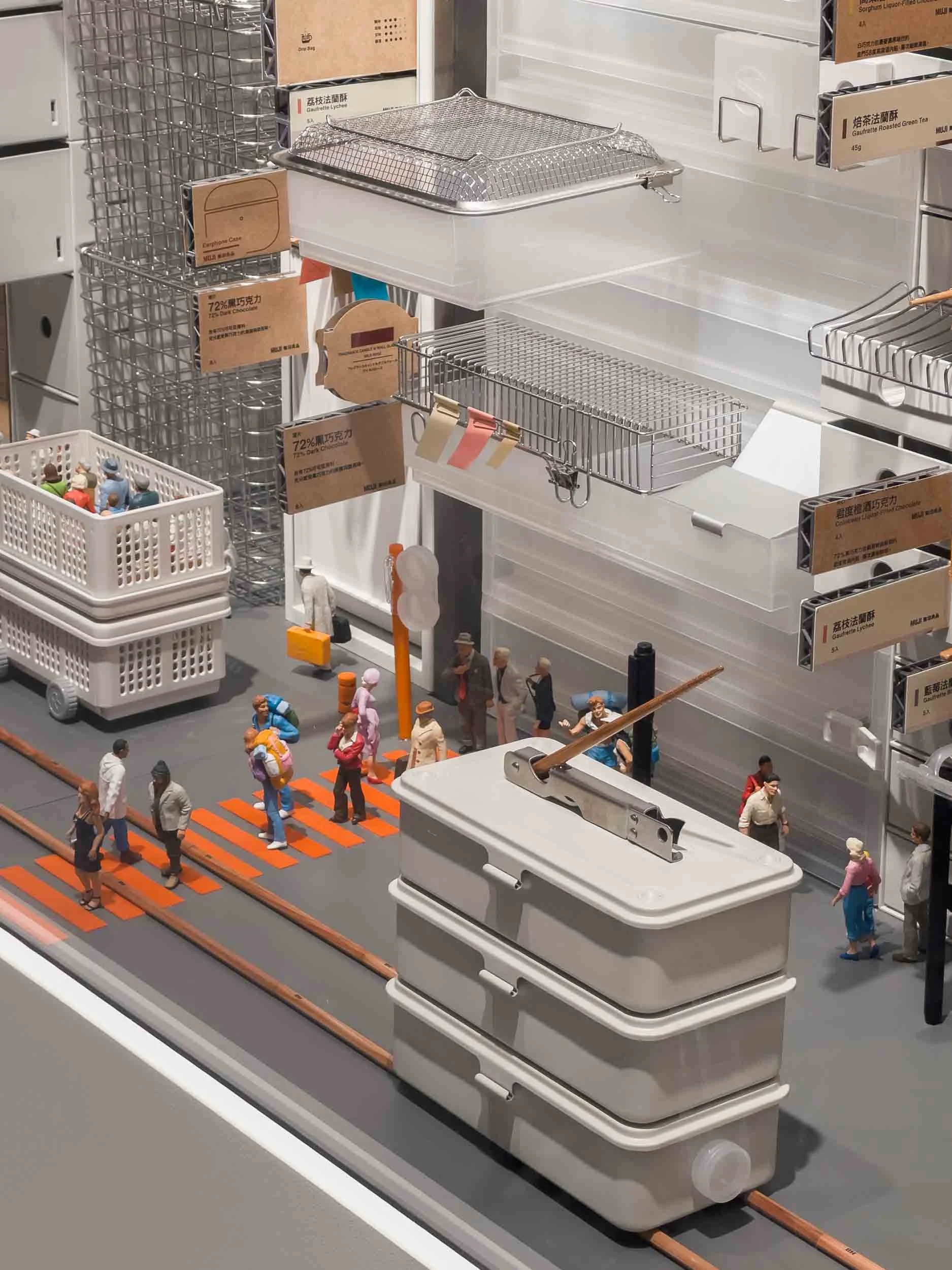 Then there’s “The Drawers of Life”, a loving portrait that captures the city’s vibrant, everyday chaos. You see the humble orange cable holder stacked as rubbish bins, a nod to the city’s relentless energy and resourcefulness. Boxes become trams and open-top double-decker buses, while wire baskets transform into construction sites, complete with Hong Kong’s signature bamboo scaffolding. Tanaka also deliberately repurposed product labels as outdoor advertising signs, and planted seven miniature versions of the exhibition poster as easter eggs, encouraging visitors to really dig into the small details.